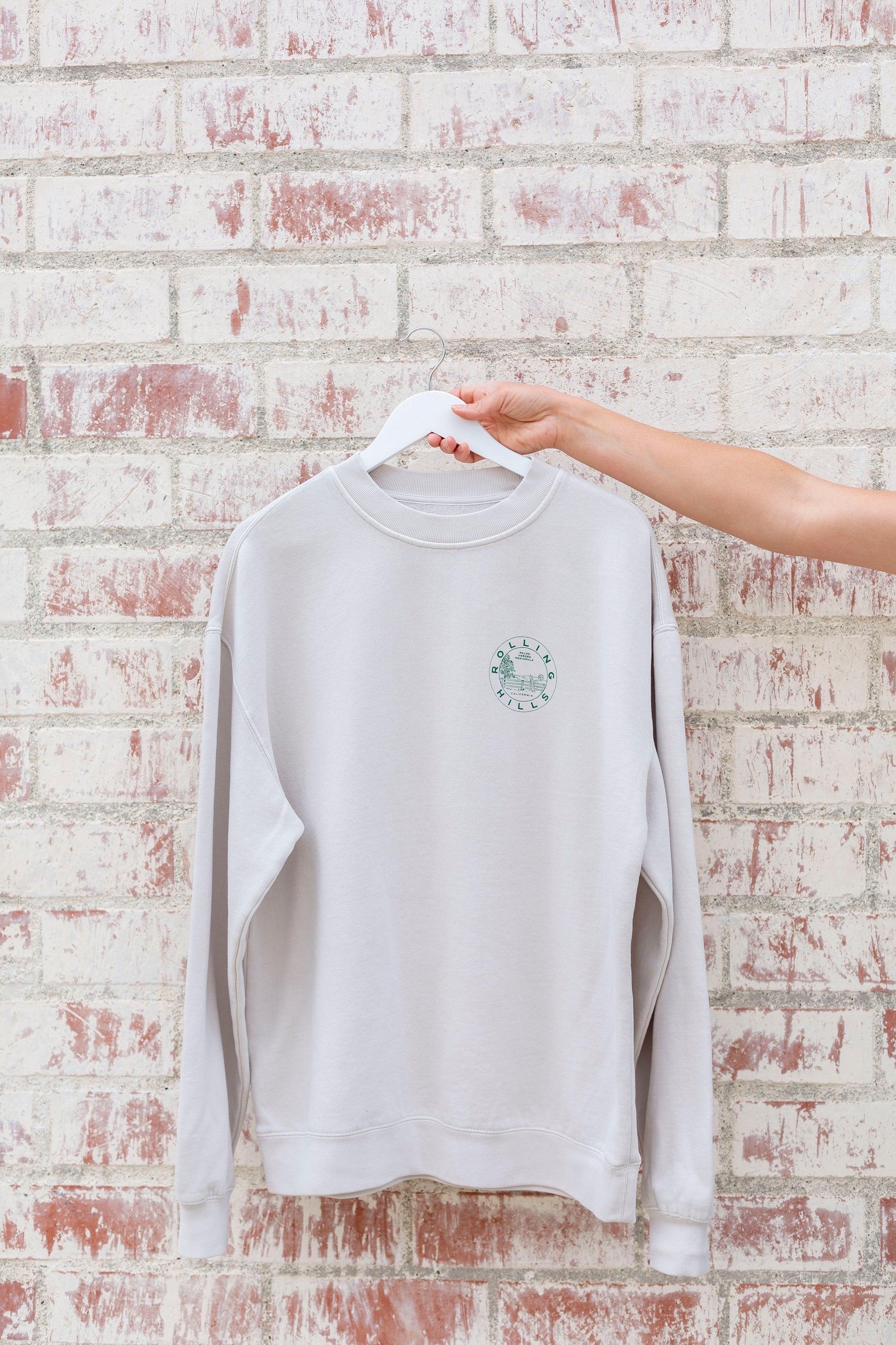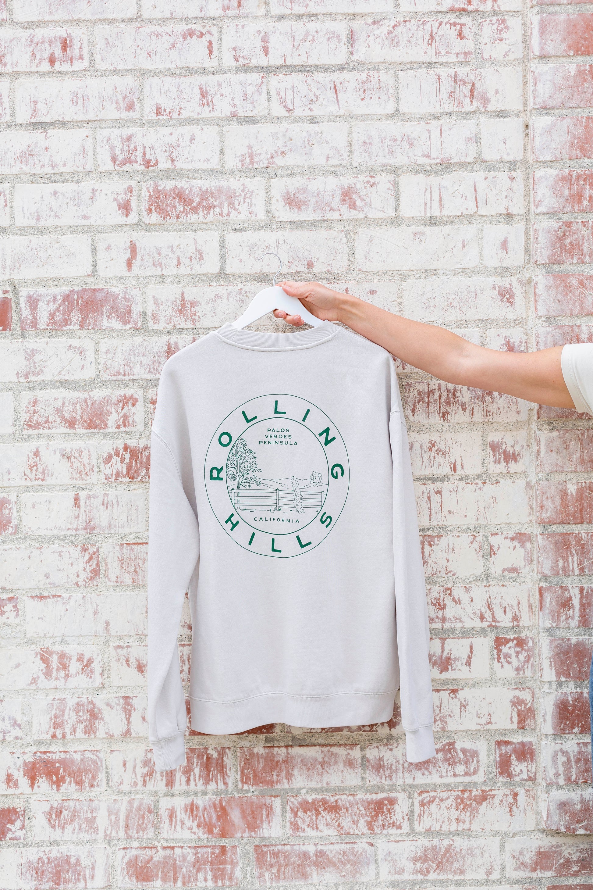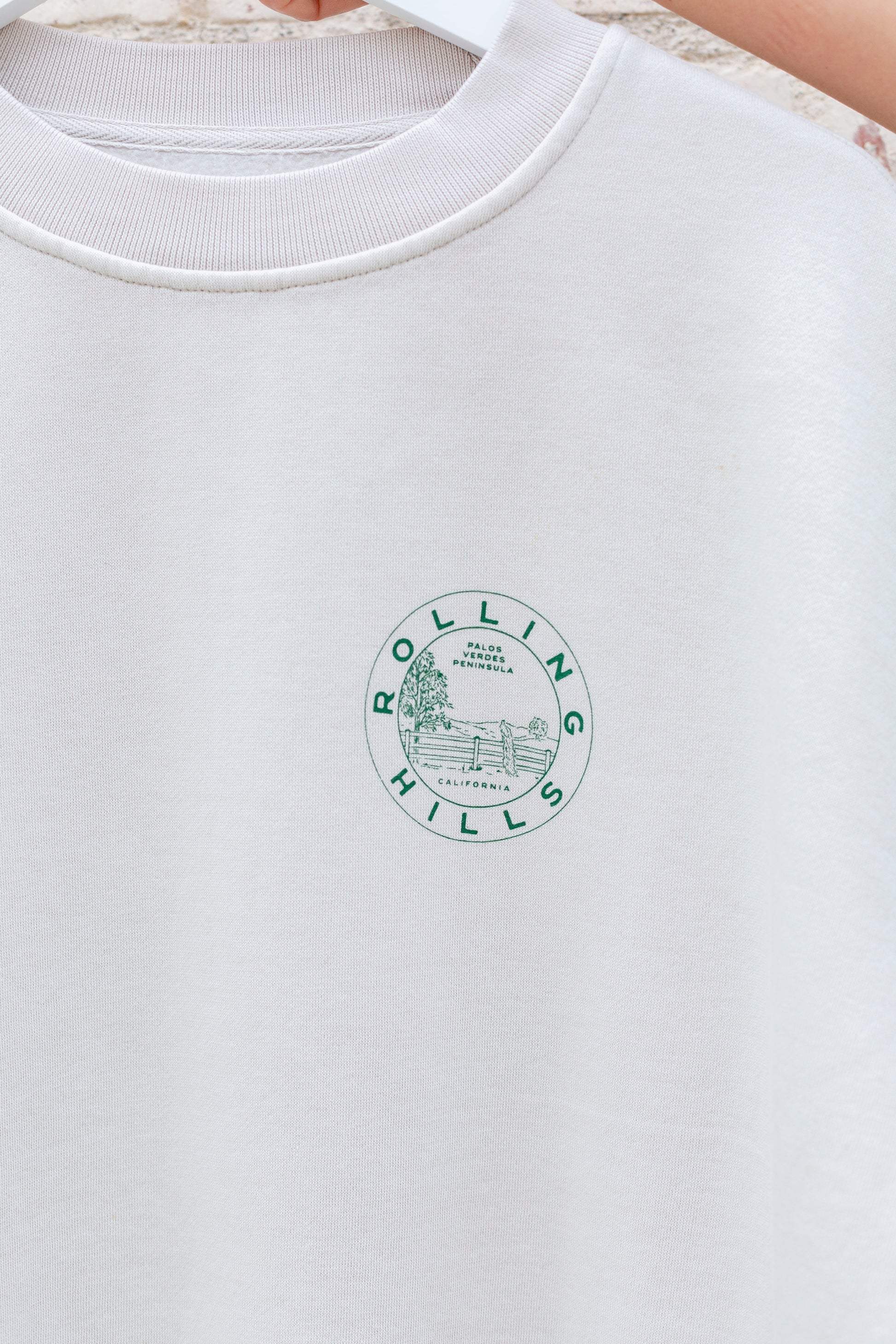 Inspired by the timeless charm of Rolling Hills, California, this sweatshirt captures the city's serene landscape — eucalyptus-lined roads, iconic white three-panel fences, and a quiet beauty that feels like home. The front and back feature a scenic, custom-designed logo in a deep forest green, standing out against the clean bone backdrop.